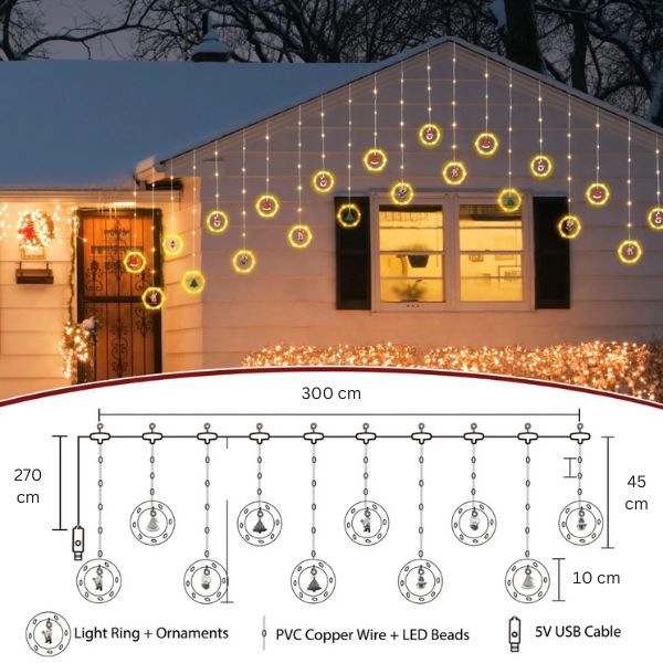 Nežne lesketajoče se lučke, skrbno nameščene v prozornih obročih, ustvarjajo očarljivo vzdušje, medtem ko na obešene figurice mečejo sijočo svetlobo.