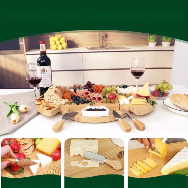 Deska vključuje 3 keramične sklede in 3 pripomočke iz nerjavečega jekla. Uporabite priloženi nož, lopatico in vilice za rezanje in serviranje, medtem ko sklede lepo držijo olive, oreščke ali omake – vse, kar potrebujete, je v enem setu.