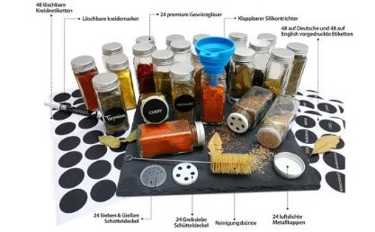 Ne dobite le 24 odličnih kozarčkov za začimbe, ampak celoten komplet, v katerem boste našli vse, kar potrebujete. Vključenih je 48 prednatisnjenih okroglih nalepk z imeni začimb v nemščini, 48 prednatisnjenih okroglih nalepk z imeni začimb v francoščini in 48 praznih okroglih nalepk, na katere lahko pišete s priloženim visokokakovostnim krednim pisalom.