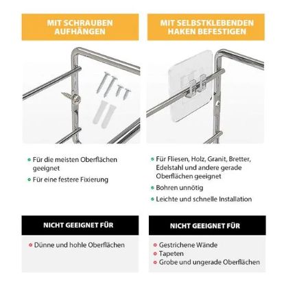 - ENOSTAVNA MONTAŽA – Za namestitev teh kovinskih stojal za začimbe lahko uporabite priložene vložke in vijake ali pa police preprosto pritrdite s priloženimi lepilnimi blazinicami. Izbira je vaša!