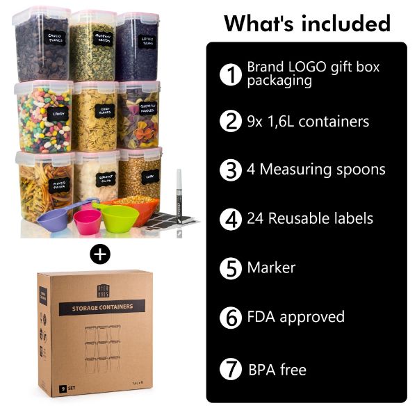- VEČJA VREDNOST ZA VAŠ DENAR – Denar, ki ga boste porabili za te posode, bo res dobro porabljen denar. Vsak komplet dobite v čudoviti škatli s pisalom, praznimi nalepkami in merilnimi skodelicami.
