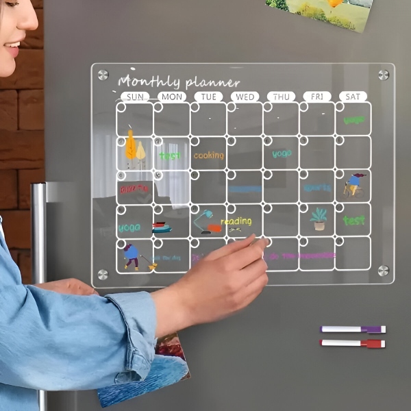 Njegova gladka, prozorna akrilna oblika ne doda le sodobnega pridiha vaši kuhinji, temveč ponuja tudi učinkovit način za upravljanje vaših vsakodnevnih dejavnosti.