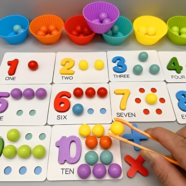 Barvite kroglice, teksture in pripomočki spodbujajo vid in dotik ter poglabljajo razumevanje zgodnje matematike.