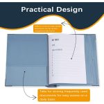 Ročno ilustrirano kazalo in samolepljive nalepke omogočajo enostavno in elegantno sledenje dokumentom.