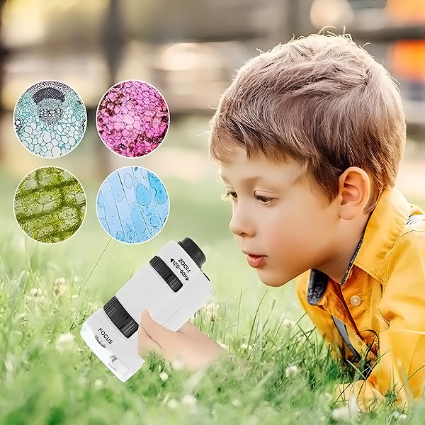 Opremljen z LED osvetlitvijo in 60- do 120-kratno povečavo lahko otroci odkrivajo fascinanten mikroskopski svet podnevi ali ponoči. Jasne in ostre slike jih bodo pritegnile in jih navdušile za nadaljnje učenje.