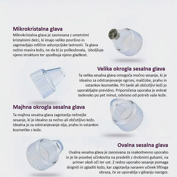 Naprava je opremljena s 4 izmenljivimi nastavki, od katerih je vsak namenjen določenim težavam kože. Za več podrobnosti o delovanju posameznih nastavkov si oglejte spodnjo sliko!
